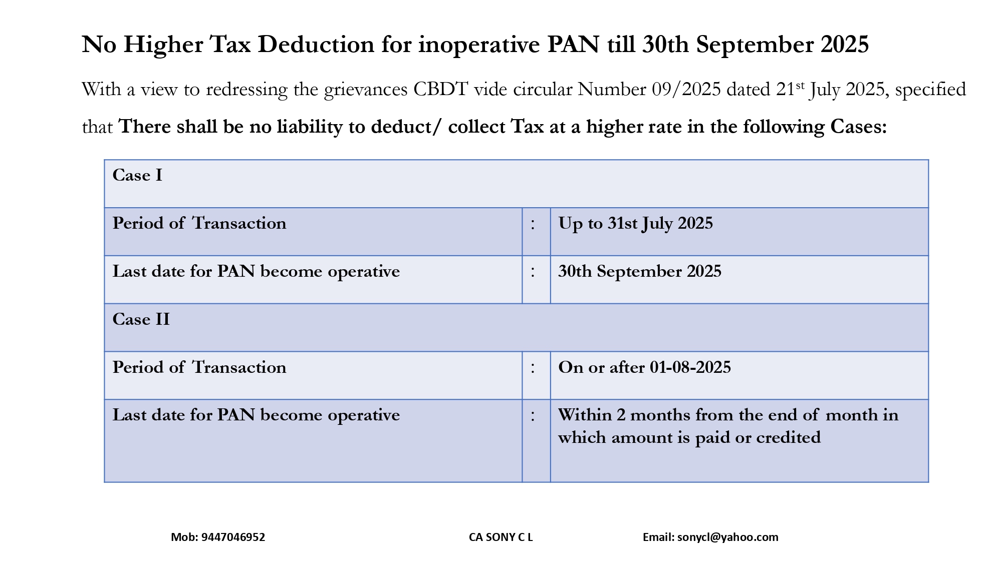With a view to redressing the grievances CBDT vide circular Number 09/2025 dated 21st July 2025, specified that for the transaction entered into up to 31st July 2025, in cases where PAN becomes operative (as a result of linkage with Aadhar) on or before 30th September 2025, There shall be no liability to deduct/ collect Tax at a higher rate.